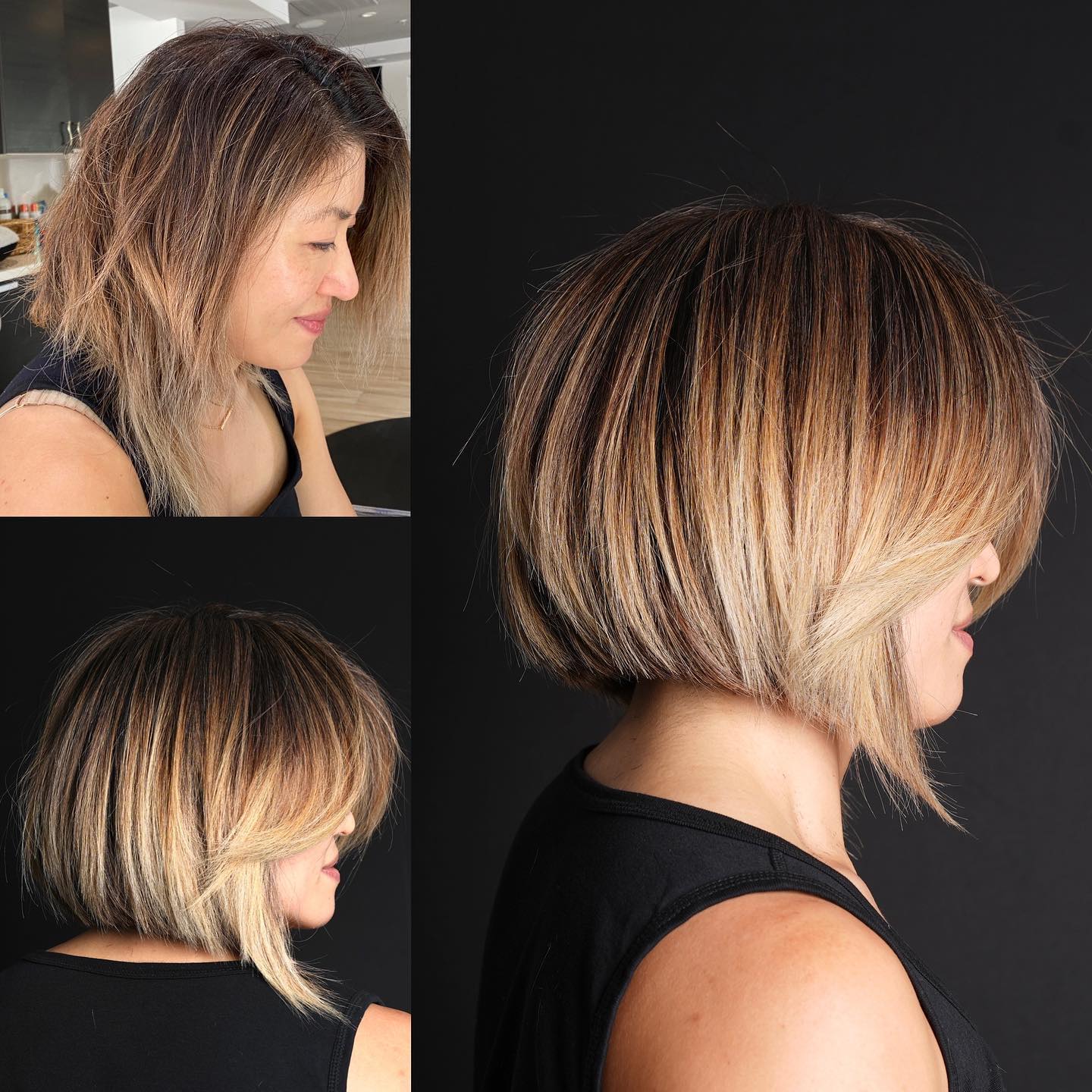 Questo bellissimo bob angolato enfatizza i toni caldi e ricchi, offrendo uno stile equilibrato ed elegante. Ideale per chi ha capelli da medi a spessi, è particolarmente adatto a visi ovali e rotondi; l’uso di un phon e di una spazzola rotonda aiuta a mantenere un aspetto liscio e voluminoso.
