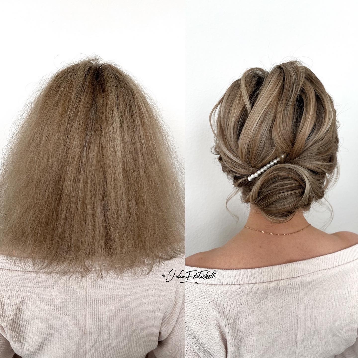 Il bob liscio ed elegante si trasforma senza sforzo in un updo voluminoso e strutturato, ornato da delicati accessori floreali. Questo stile è adatto a chi ha capelli fini o medi e aggiunge volume ai visi a forma di diamante o di cuore. Utilizzate uno spray volumizzante per aggiungere volume alle radici e fissate l’updo con forcine, terminando con una lacca a tenuta forte per mantenere intatto il look.